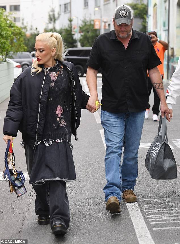 Loved-up: The 53-year-old pop singer and the 46-year-old country artist affectionately held hands while taking a walk through the city's Downtown districtGwen's platinum blonde hair fell onto her shoulders and contrasted well with the dark tone of her clothing.