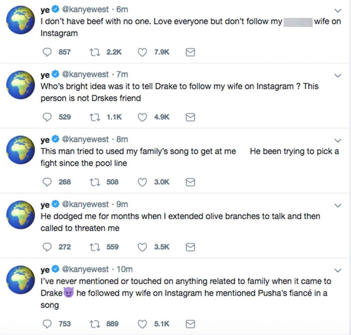 Although West and Drake’s beef is nothing new, the latest drama began earlier this month, when West took aim at Drake, tweeting over 125 times and claiming that the “In My Feelings” rapper threatened his family, targeted people suffering from mental illness and contacted his mother-in-law Jenner behind his back.