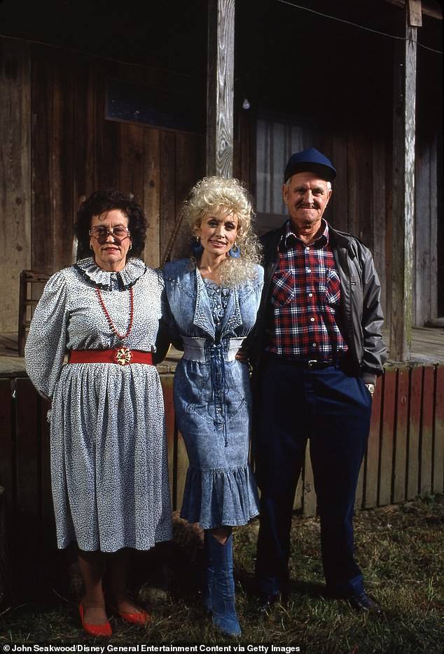 Dolly posing for a photo with her parents Avie and Robert in 1987. Her outrageous image stems from a local ‘tramp’ (Parton’s word) she would see growing up