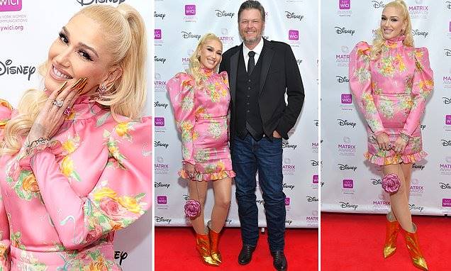 Gwen Stefani and her husband Blake Shelton attended the 2022 Matrix Awards in New York City. Stefani looked stunning in a pink floral mini dress with long puff sleeves and ruffles at the hem and collar. She paired the dress with metallic gold booties and a glittery pink flower-shaped purse. Her signature blonde hair was styled in a curly half up, half down 'do, and she accessorized with pink jewel earrings and chunky rings. Stefani opted for a glossy nude lip and a traditional cateye flick with bronze eyeshadow.