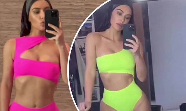 Kim Kardashian, co-founder of SKIMS, debuted the brand's new neon line in a cut-out bodysuit and bikini. The global shape-wear line is valued at $3.2 billion, with rapper Kanye West still owning a 5% stake in the company. Despite criticism from her ex-husband, SKIMS continues to thrive. The new Fits Everybody line will feature similar sexy cut-out designs in black and brown, as well as basics like tanks, bras, and shape-wear. Kim showcased the new collection on her Instagram stories, modeling a neon yellow dress and other pieces. She and Kanye were married from 2014 to 2022 and have four children together.