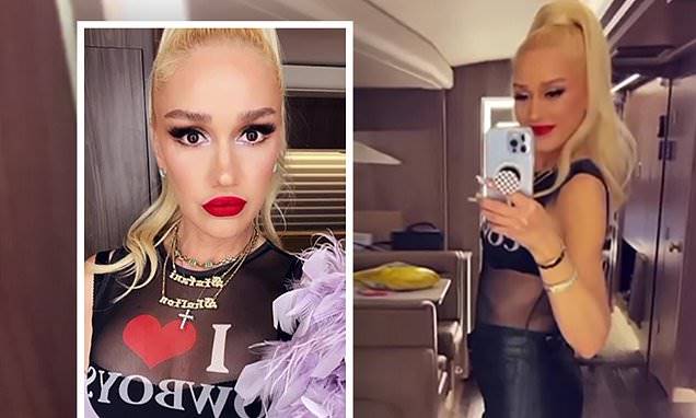 Gwen Stefani displayed her toned figure in a sheer top with the words 'I love cowboys' on it while filming a video on a tour bus. She paired it with leather leggings, fringed boots, and a purple boa for added color. Stefani is currently accompanying her husband Blake Shelton on his Back to the Honky Tonk tour. The singer accessorized with sparkling jewelry and had her platinum blonde hair tied in a ponytail. Stefani and Shelton met on The Voice and got married in 2021 after dating since 2015. She expressed feeling guided towards him and attracted to his genuineness during the early stages of their romance